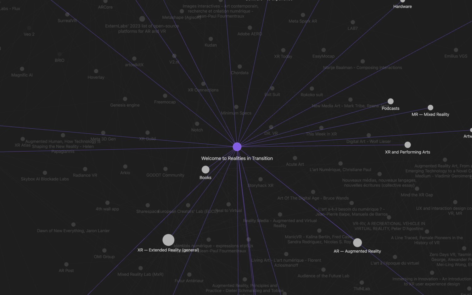 This tool aims at gathering different types of resources under the large scope of XR, in a common and shared space, accessible both via a summary “Maps of contents” and a visual “Graph”. Tools, channels, softwares, hardwares, networks, metaverses, and many more.